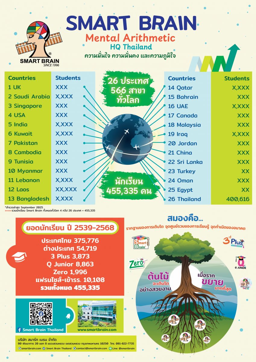 Warmest greetings to you all from Smart Brain Headquarters, Thailand. It gives me immense pleasure to welcome you to the best Abacus and Mental Arithmetic program’s brand “Smart Brain” official website.
